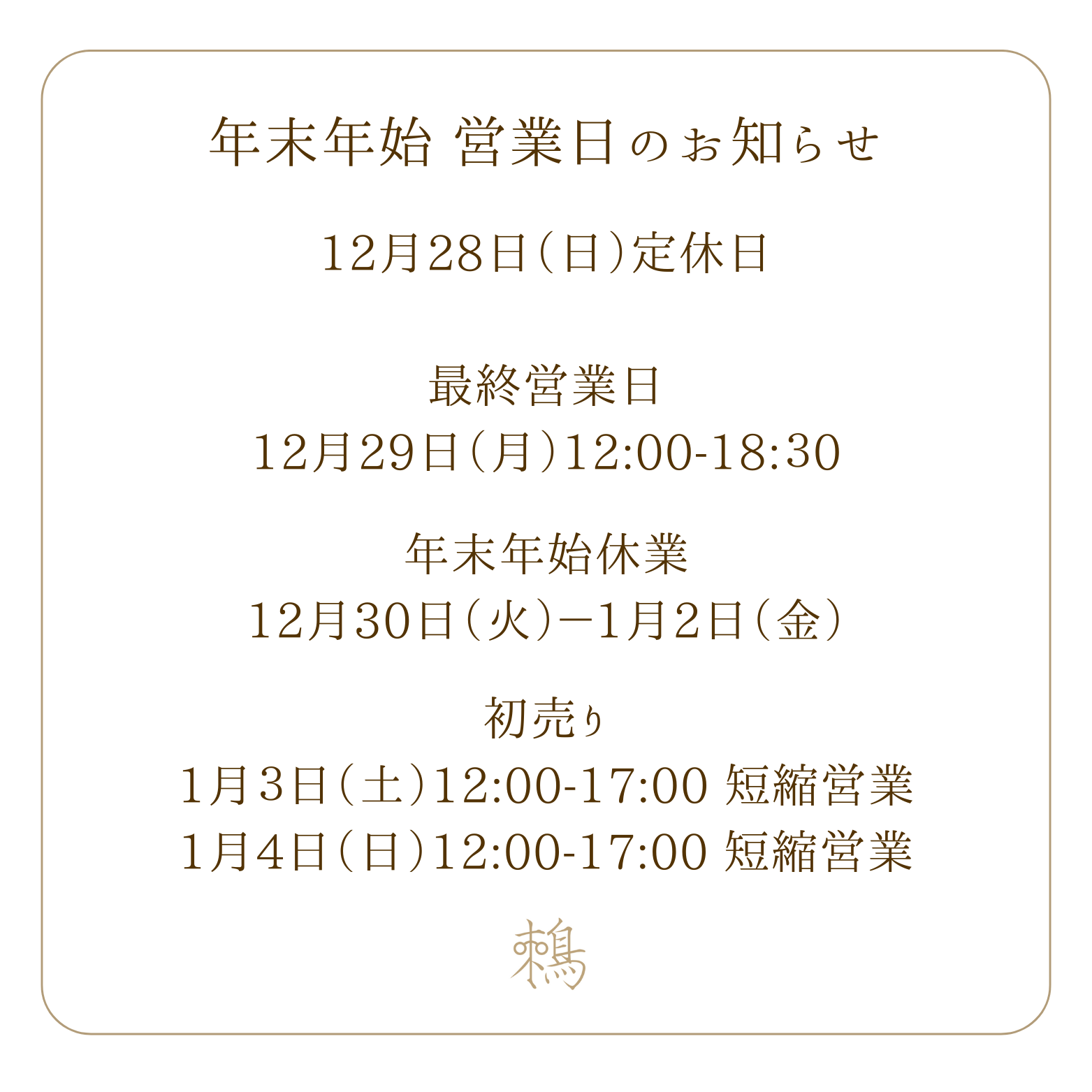 1月4日(日)12:00-17:00 短縮営業